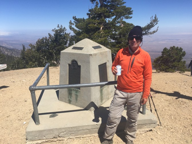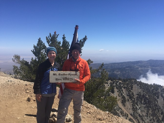 Woke up yesterday (Mother’s Day) and headed for Mt Baden Powell. He was the founder of the Boy Scouts and this 9399′ Peak was named for him. The PCT goes very near the summit but not to it. It was a very steep trail. Dropped our packs at the summit trail and went up. Lots of people up there. We were the only thru-hikers. Someone left 3 Santa Monica beers on the dedication statue for thru-hikers. We shared one and left a thank you.